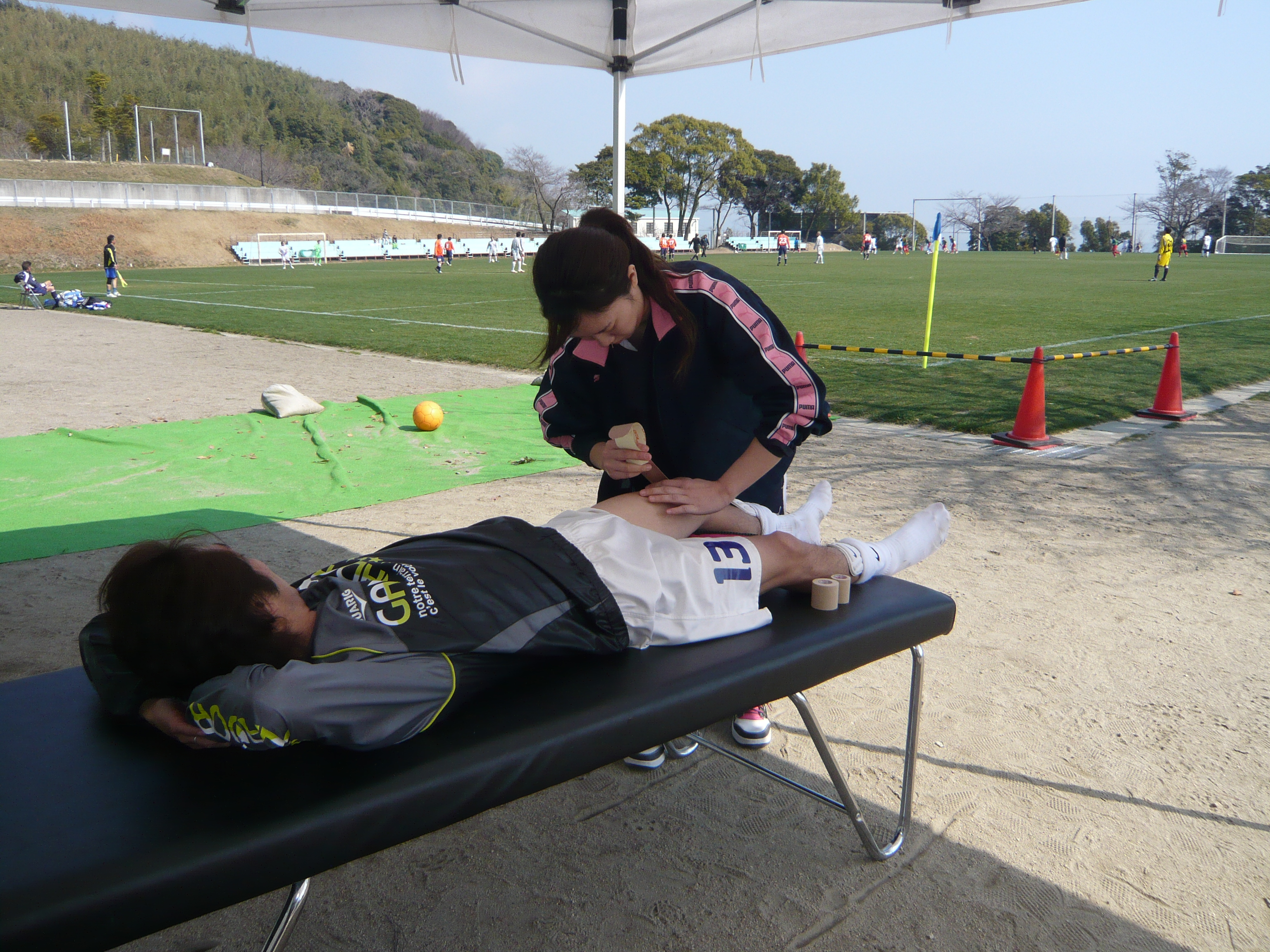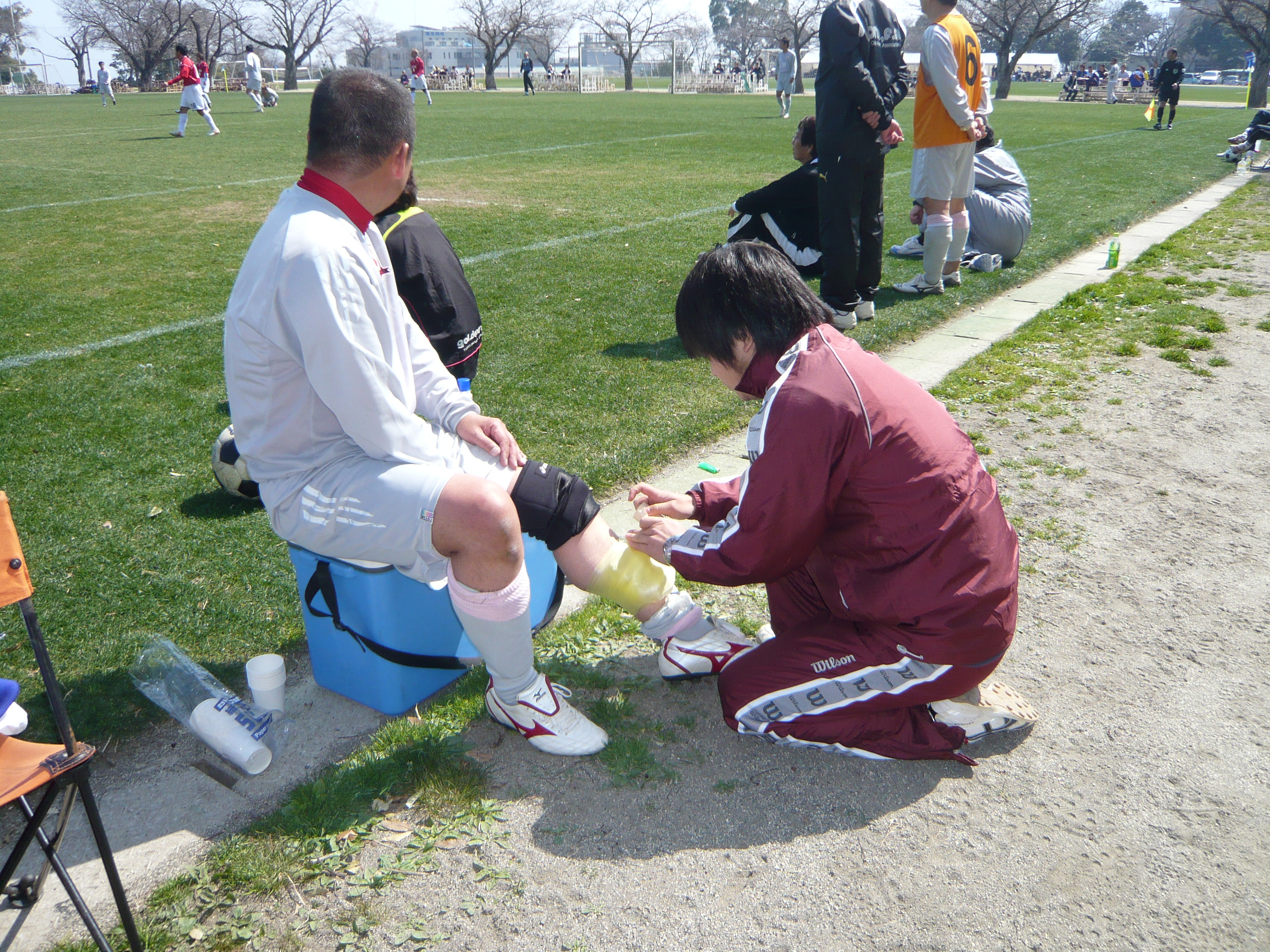 プレー中に痛めた選手に 応急処置として氷でアイシングをしてます。その後、この選手はプレーに復帰されました。