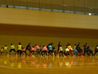 向かい合って手で押し合うバランス訓練。選手と一緒に、とっても楽しそうでした。